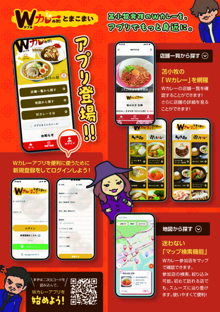 お知らせ 活動情報 2026年4月23日 Wカレーがアプリに!!📲 アプリでもっと身近に。 Wカレーマップがアプリになってより便利になりました! 店舗一覧から探す🍜🍛 苫小牧の「Wカレー」を網羅Wカレーの店舗一覧を確認することができます!さらに店舗の詳細を見ることができます! 地図から探す🗺️ 迷わない「マップ検索機能」Wカレー参加店をマップで確認できます。参加店の検索、絞り込み可能。初めて訪れる店でも、スムーズに辿り着けます。使いやすくて便利! 便利に使うために新規登録をしてログインしよう!📍